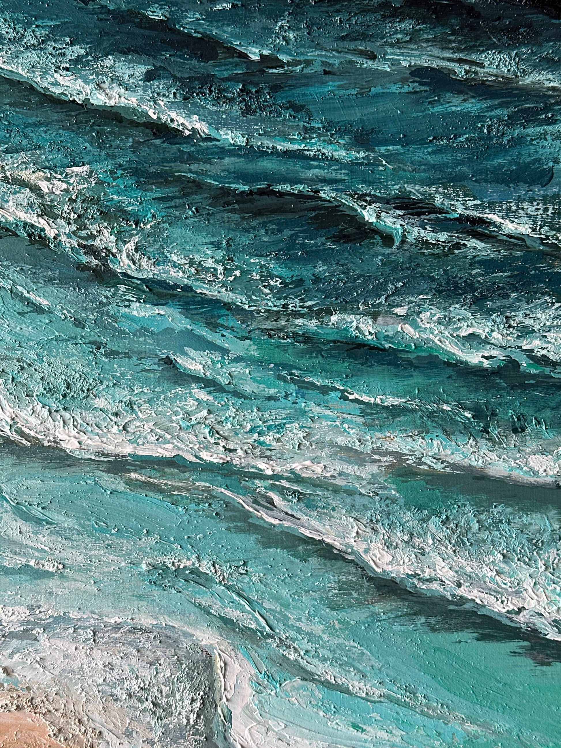 State of Flow reflects my personal experience observing the movement and energy of the ocean. I worked with sand, acrylic gesso and modeling paste to create texture, relief and a strong physical presence on the surface.