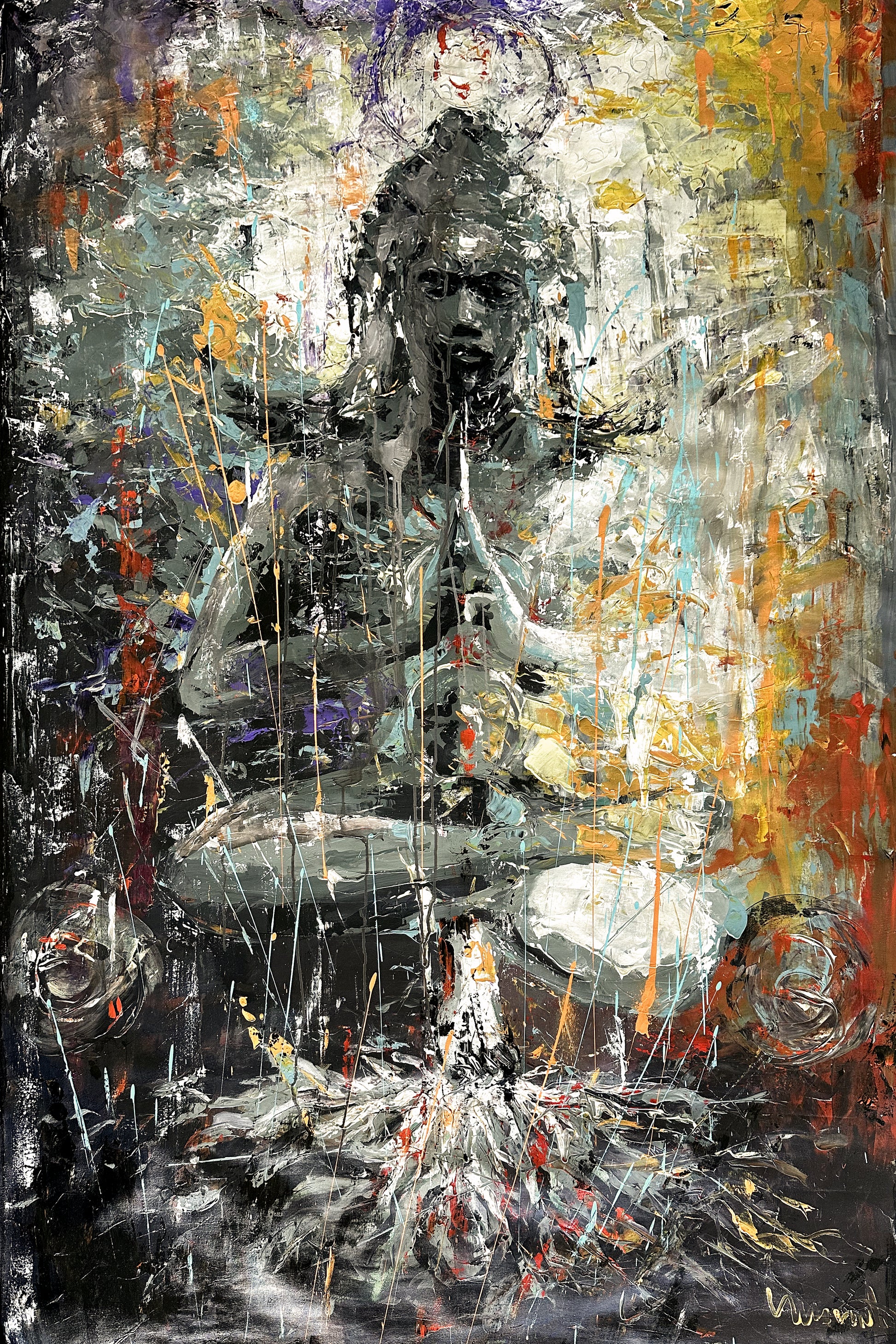 Em "Como Eu Vejo Shiva", procurei capturar a essência da dualidade e da unidade espiritual. A pintura reflete a jornada transformadora da evolução espiritual, onde as aparentes dualidades da existência se fundem em um todo singular e harmonioso. As cores e a composição visam transmitir essa mudança profunda em direção à unidade e ao esclarecimento.