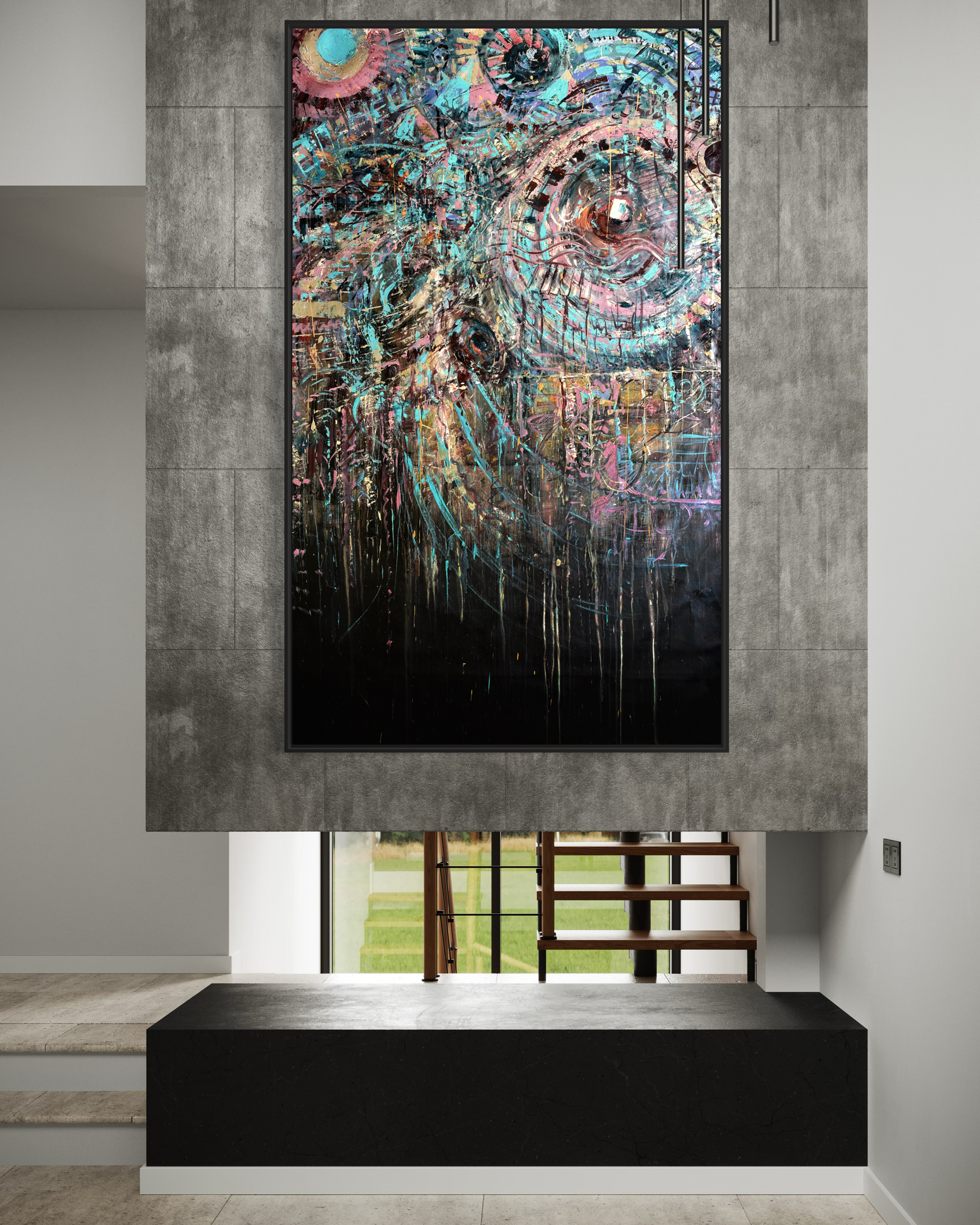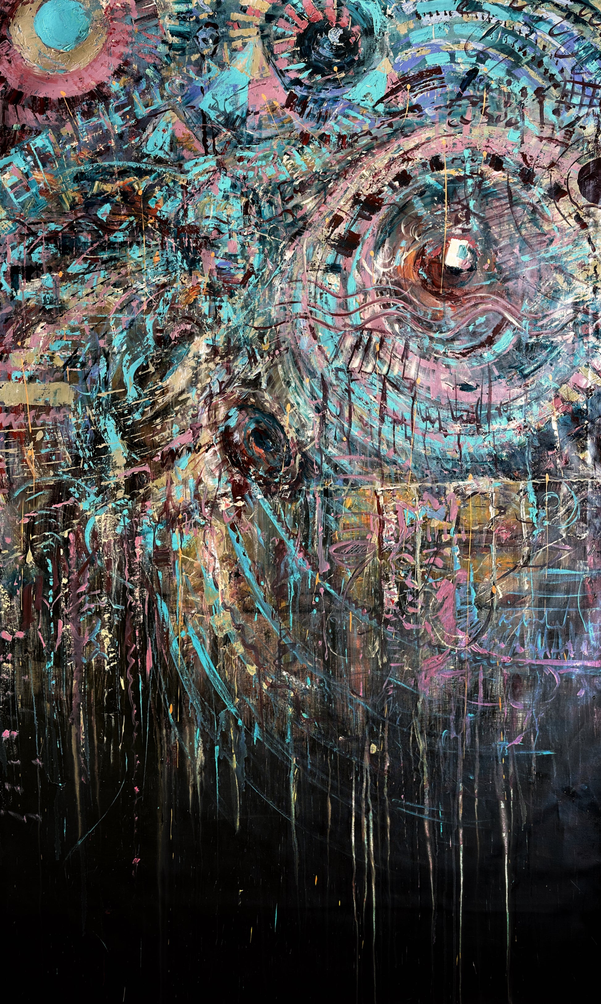 Em "O Som", procurei conectar as experiências auditivas e visuais. A pintura incorpora a energia e a ressonância das ondas sonoras através do uso dinâmico de cores e texturas. A peça convida os espectadores a sentir a música e as frequências que inspiraram sua criação, traduzindo uma experiência sensorial abstrata em uma forma tangível.